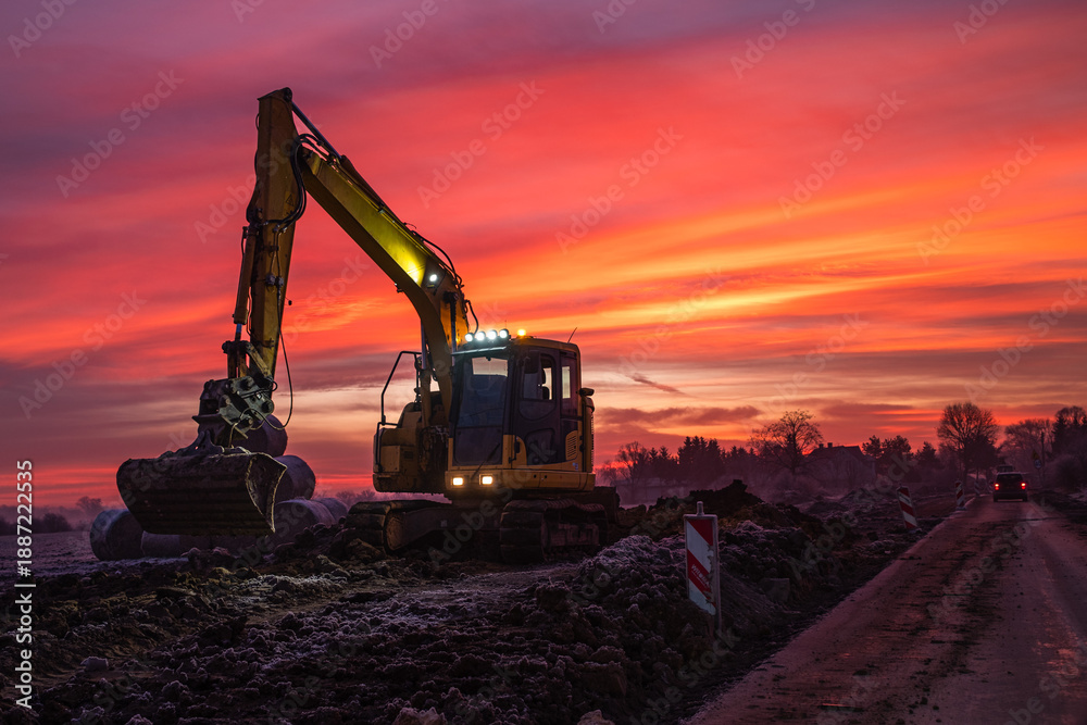 A yellow excavator stands on a construction site next to a road, silhouetted against a dramatic and vibrant orange and red sunrise. #1887222535