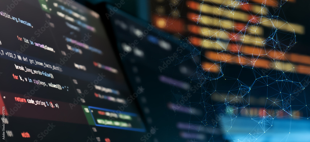 Abstract Software Code Diff Screen with Digital Network Mesh Overlay and Cyber Technology Programming Background #1935477105