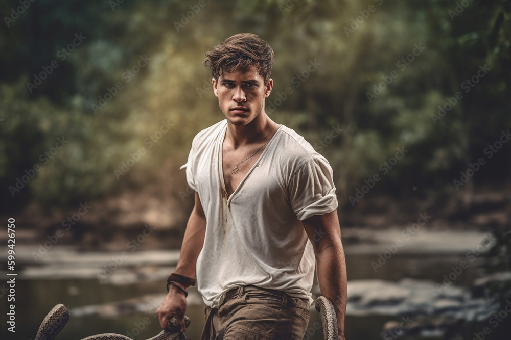 adult young man survivor jungle adventure survivor with dirty face and dirty shirt slightly torn, in the background trees, a snake. Generative AI #599426750
