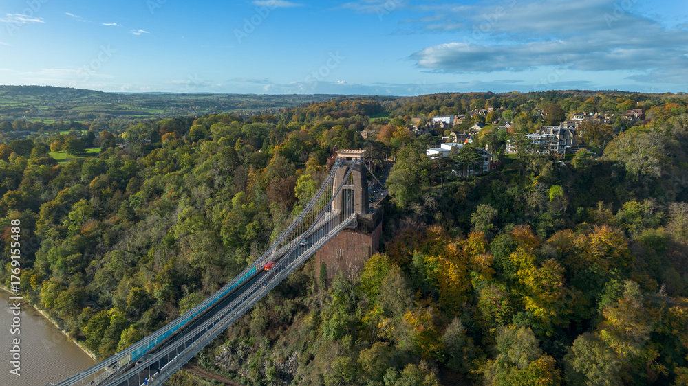 Aerial drone view of the Clifton Suspension Bridge spanning the Avon Gorge in Bristol, England. #1769155488