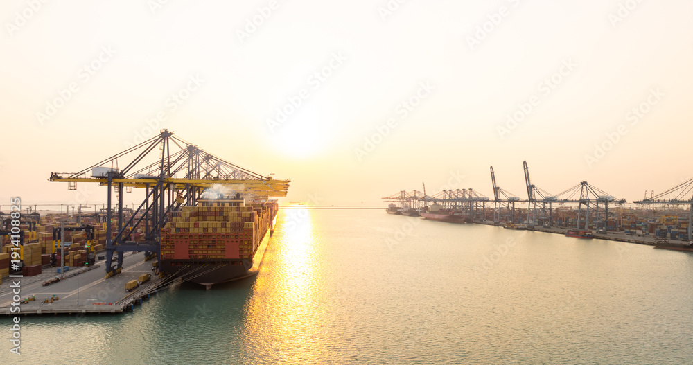 Aerial view Container cargo ship loading unloading container import export sea port, Global trade business container cargo ship freight shipping commercial trade logistic transportation international. #1914108825