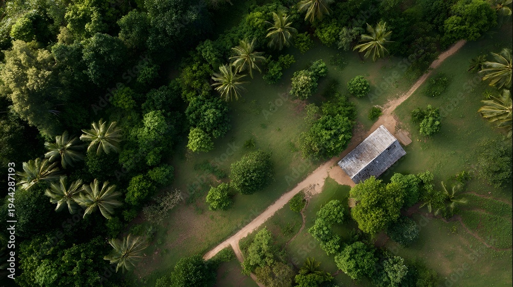 Aerial view of a remote tropical house surrounded by lush green forest and trees with a dirt path #1944287193