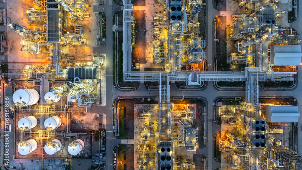 Aerial view Oil and Gas refinery plant at night, Global business energy logistic transportation, Oil and gas refinery petrochemical industrial, Petrochemical refinery industrial energy supply chain. #1763161866