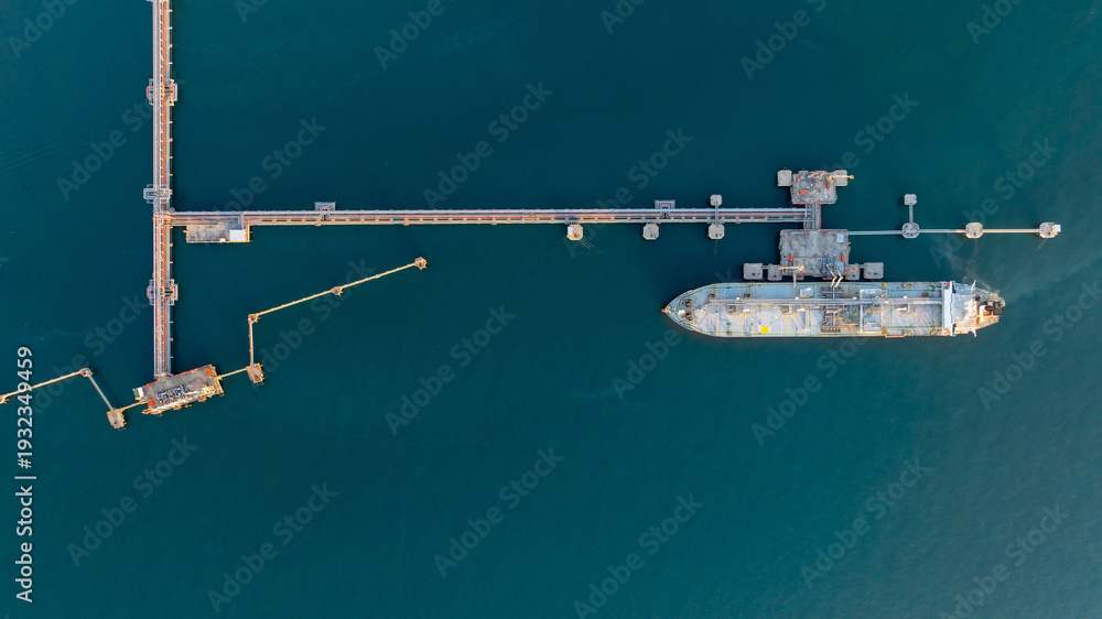 Aerial view oil and gas ship tanker vessel loading unloading in oil terminal station refinery, Global business import export logistic transport sea freight cargo tanker, Oil gas tanker ship at port. #1932349459