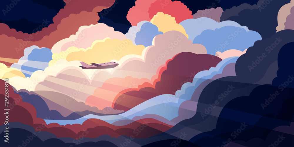 Airplane flying above beautiful clouds in sunset or sunrise light. Travel concept. Colorful vector illustration #292331810