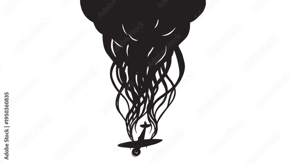 Airplane silhouette engulfed by black tentacles emerging from a dark cloud, representing a surreal and terrifying aerial encounter. #1950360835