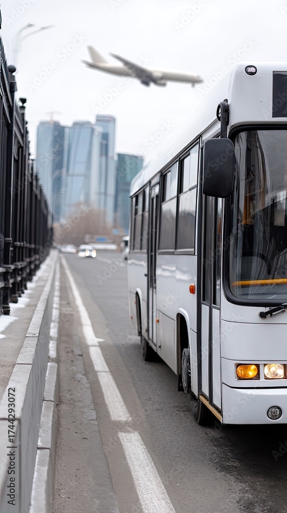 An airplane approaches landing while a bus drives along the road, showcasing the hustle and bustle of travel on a clear day #1744293072