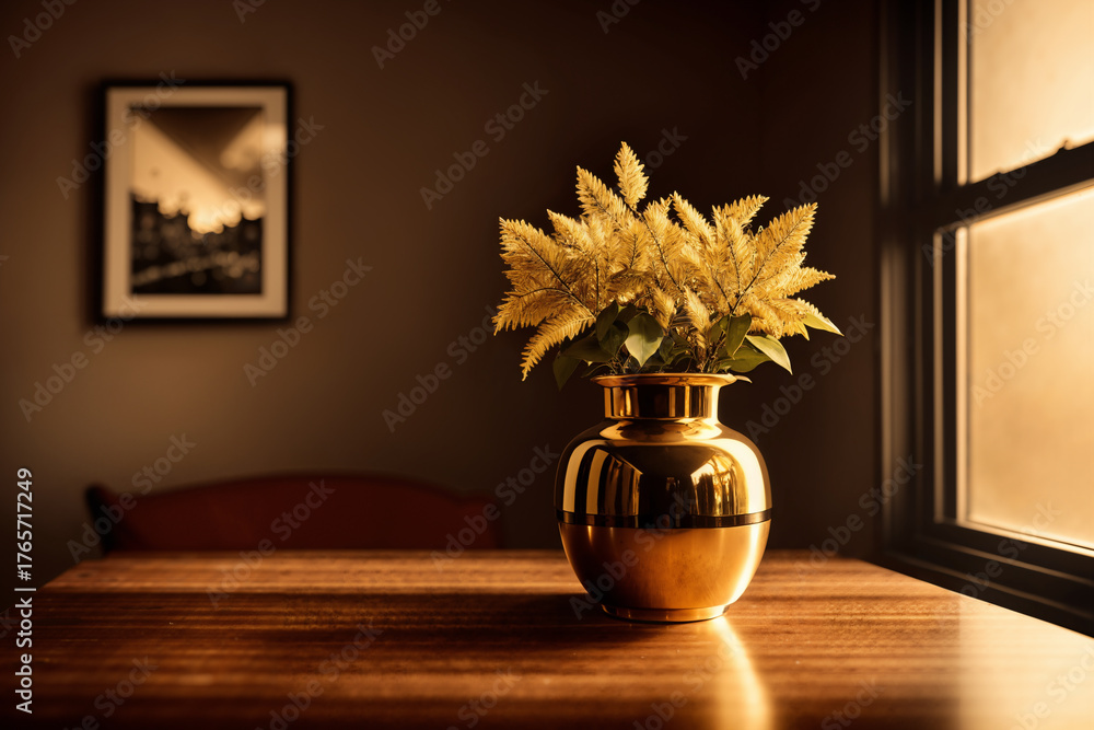 An elegant vase with sprigs of grass and flowers on a table nea window, a picture on a wall. A beautiful decoration. #1765717249