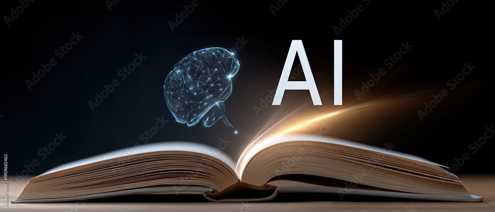 An open book shows an ai icon glowing on the cover with symbols of digital technology, creating a setting for knowledge sharing #1909665463