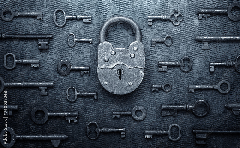 Antique door locks and keys on an old background. Old padlock and key. set as a symbol of security, closeness, history, protection, safety etc. Conceptual background. Blue toning. #740037063
