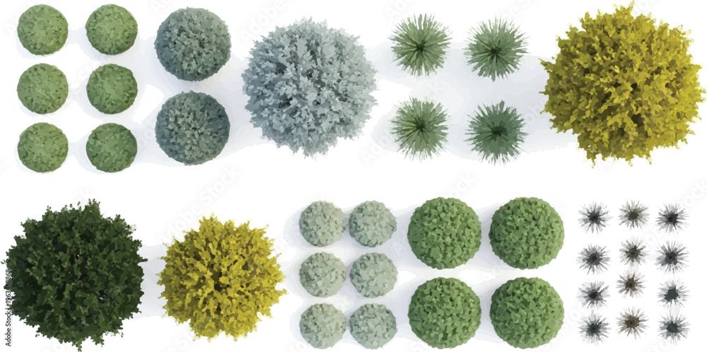 Architectural landscape plan symbols, top view tree and shrub icons for site mapping, 2D garden design elements in green and yellow shades, professional vegetation vector set isolated PNG with #1963468868