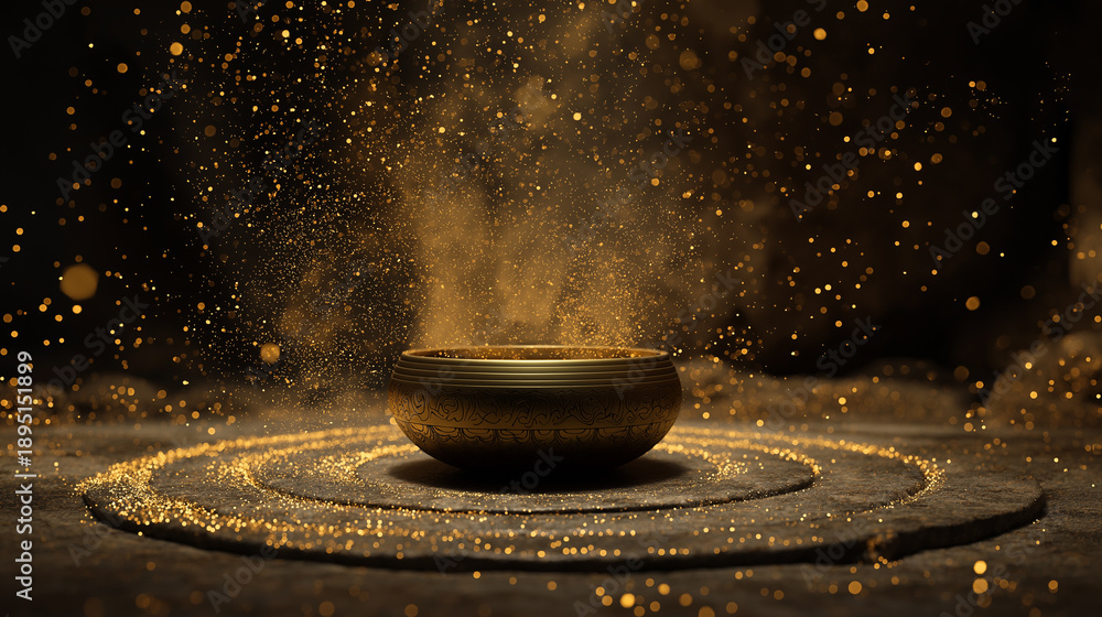 Atmospheric close up of ornate golden Tibetan singing bowl with swirling golden dust particles around it, spiritual meditative energy and warm light #1895151899