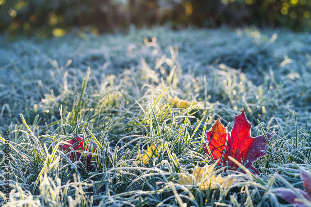 Autumn landscape with a bright red maple leaf lying on the grass covered with blue shiny crystals of hoarfrost on a frosty morning #1755008048