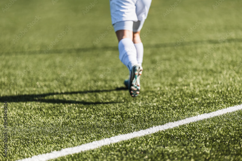 Back view of a soccer player running on a green grass pitch with white touchline. Close-up of legs in soccer cleats and white socks during a match or training. Concept of sports, motion #1942045534
