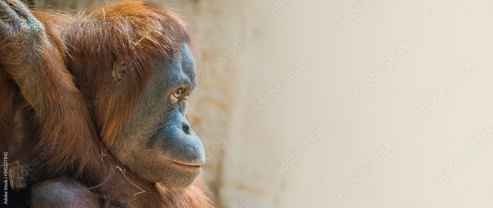 Banner with portrait of depressed Asian orangutan with copy space for text, male, adult, closeup, derails #305237842