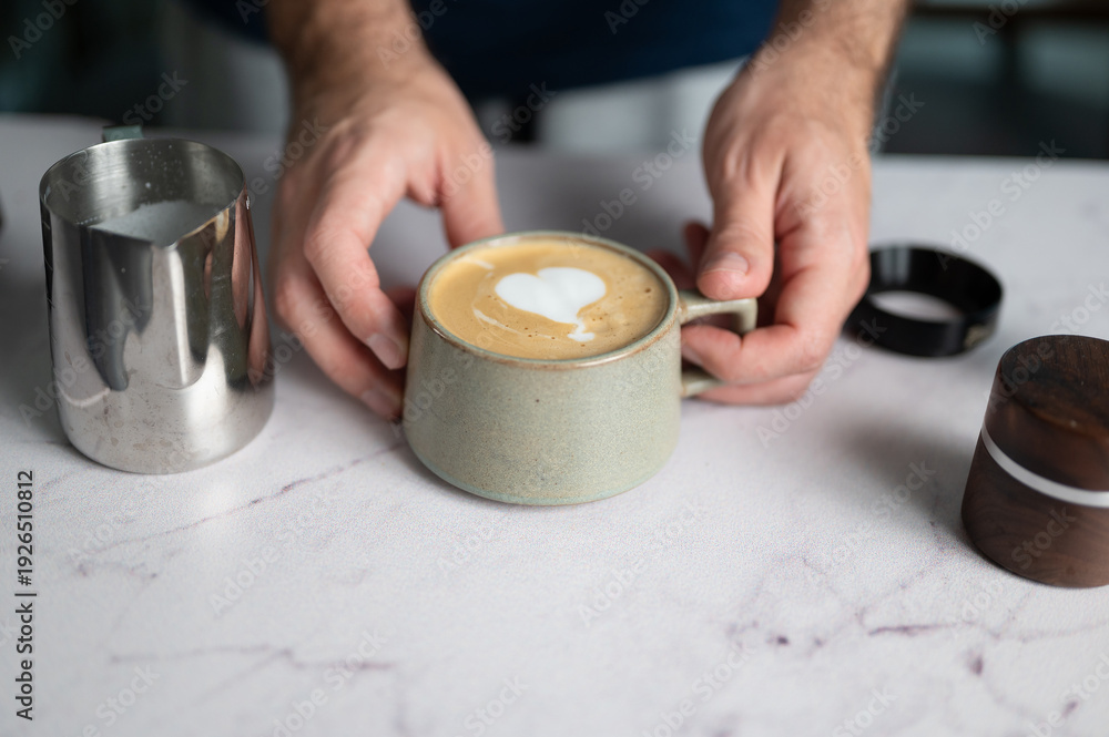 Barista Pouring Coffee With Beautiful Heart Latte Art At Home #1926510812