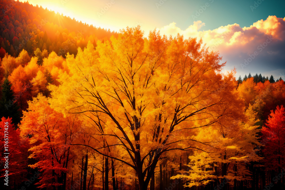beautiful autumn landscape of forest at sunset, yellow trees and sunlight #1765717426