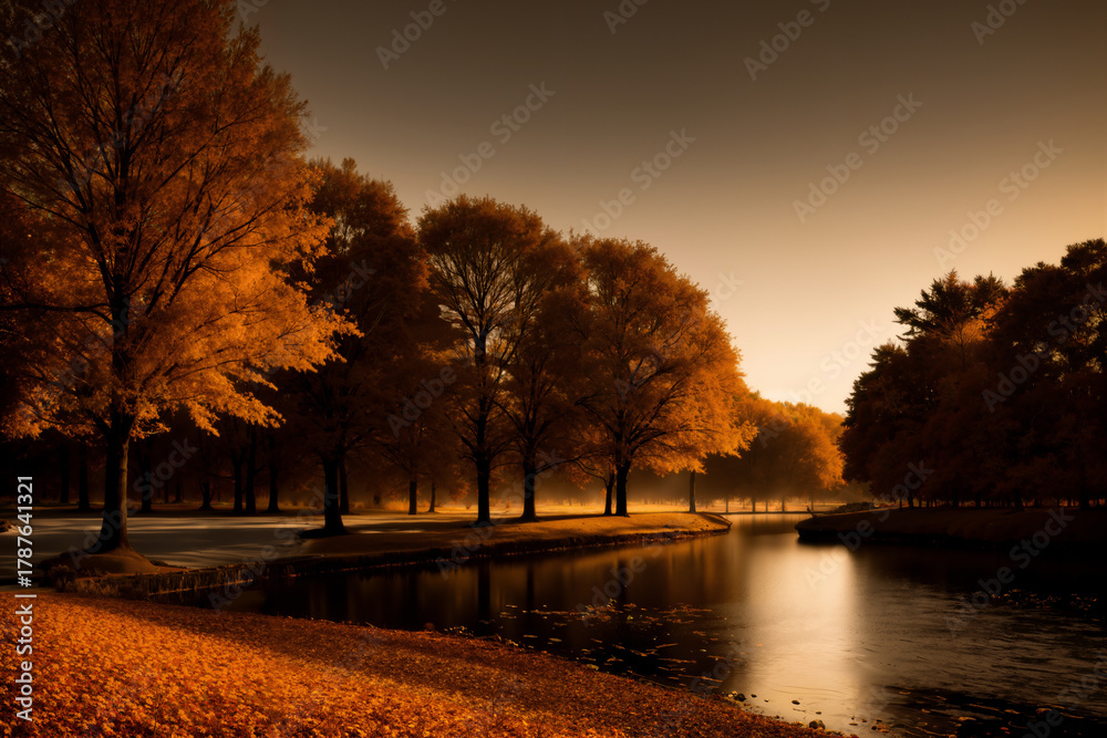 beautiful autumn landscape of forest at sunset, yellow trees and sunlight #1787641321
