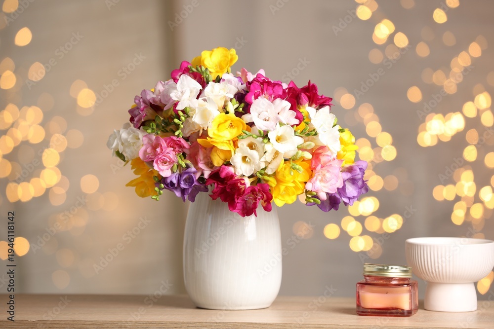 Beautiful freesia flowers in vase and candle on wooden table indoors. Bokeh effect #1946118142