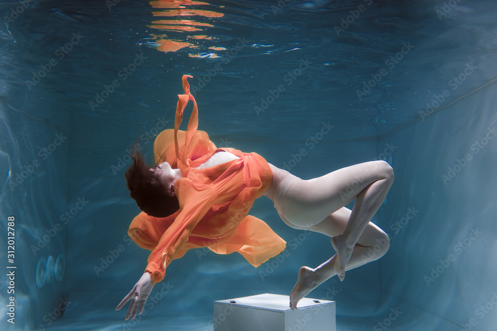Beautiful girl swims underwater in a yellow dress. 2020 New Year trend Aqua Mente and fatom blue and lush lava. Underwater girl mermaid. Model suitable for advertising #312012788
