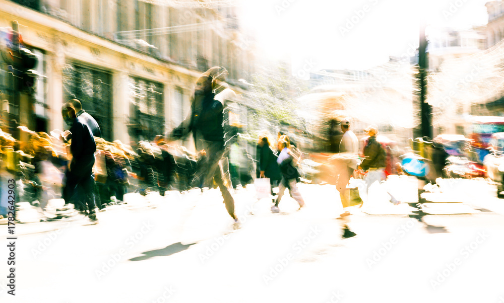 Beautiful postmodernism motion of people walking in London street at sunny day. Shoppers and tourists crossing Oxford circus #1782642903
