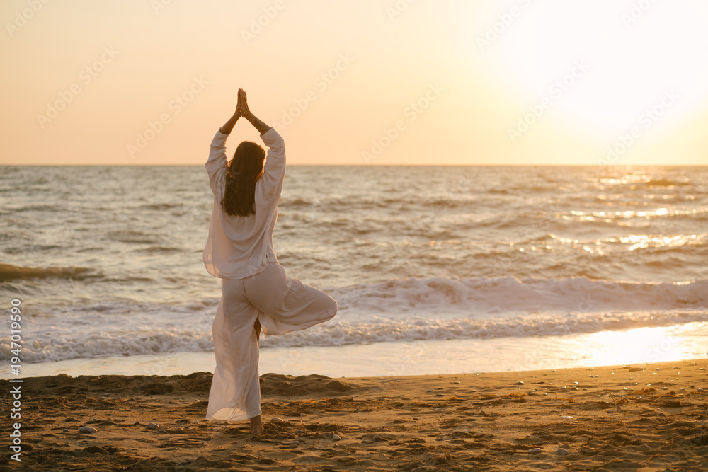 Beautiful 40 years old woman having yoga exercises on th beach at sunset. #1947019590