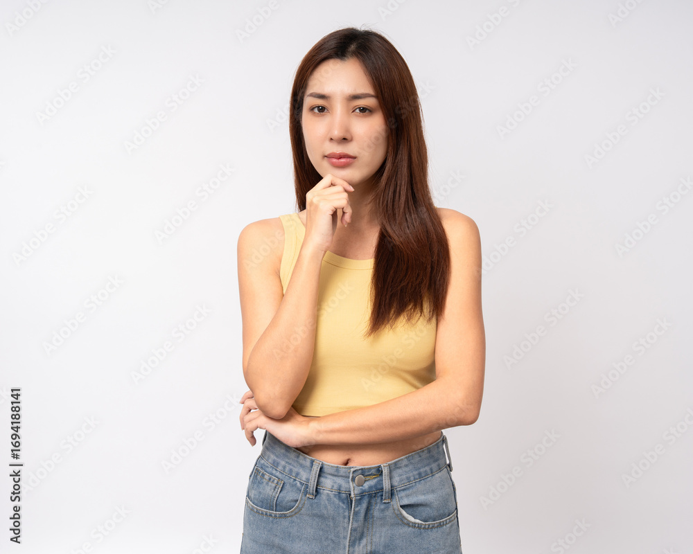 Beautiful young asian woman in yellow shirt. Charming female lady standing pose thinking on isolated white background. Asian woman cute people have idea with copy space. #1694188141