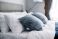 Bed maid-up with clean white pillows and bed sheets in beauty room. Close-up. Lens flair in sunlight. #202074742