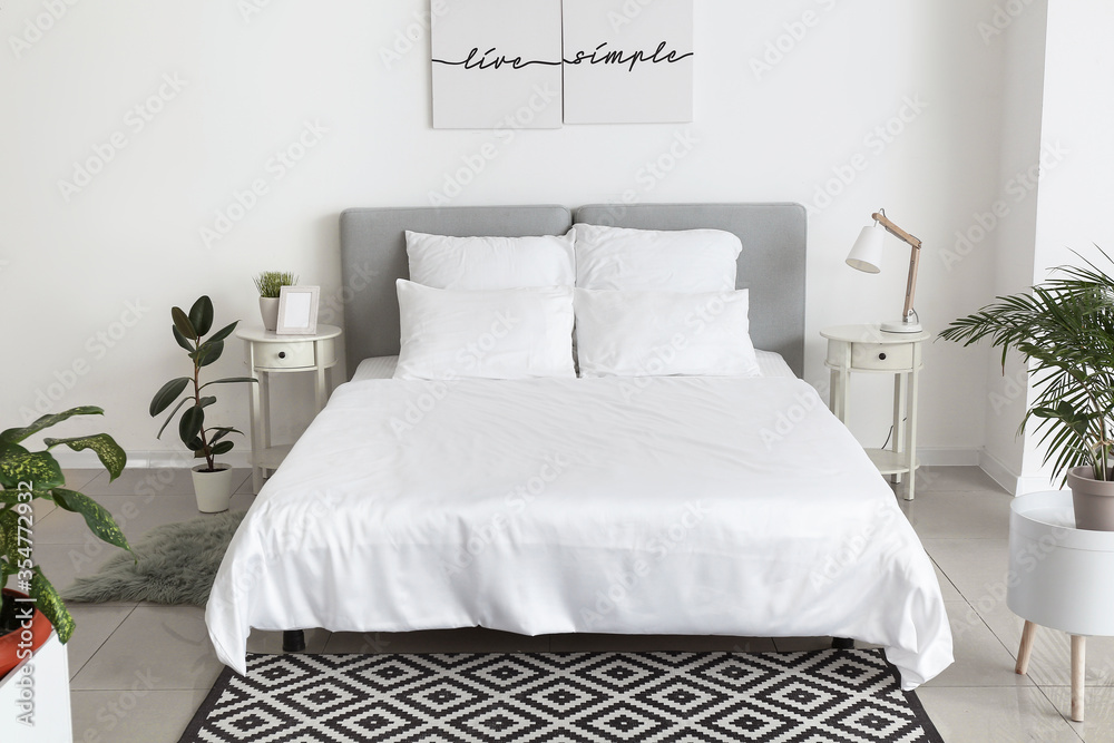 Big comfortable bed with clean linen in room #354772932