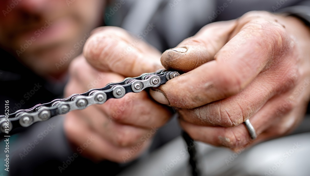 Bike repair and maintenance showcasing a close-up of hands fastening a bicycle chain between a motorcycle. #1965452016