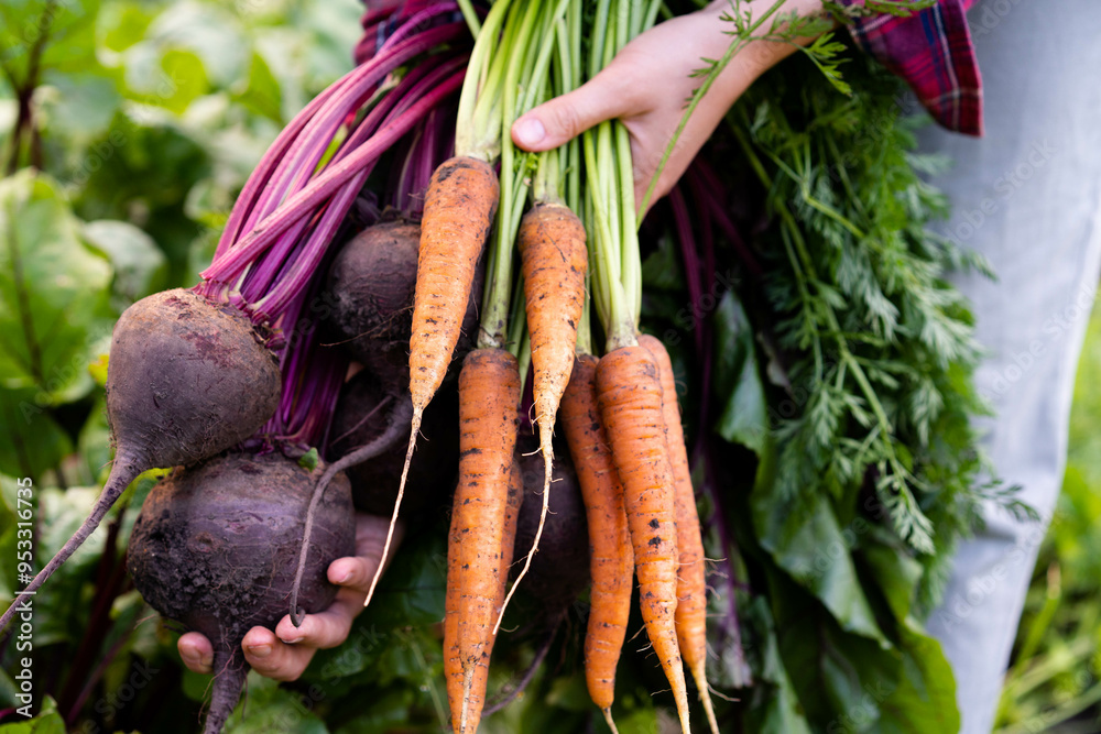 bio vegetables in the hands of a farmer, carrots and beets dug out of the ground, a good harvest of eco products #953316735