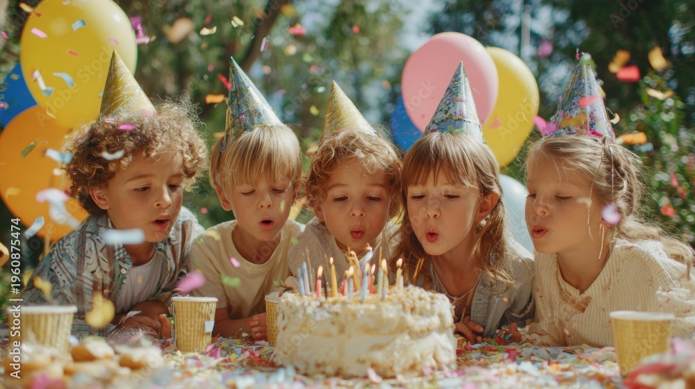 Birthday celebration theme for party event. A group of children blowing out candles on a birthday cake surrounded by colorful confetti and balloons. The cake is adorned with lit candles, glasses. #1960875474