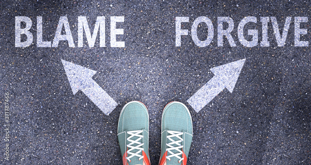 Blame and forgive as different choices in life - pictured as words Blame, forgive on a road to symbolize making decision and picking either Blame or forgive as an option, 3d illustration #371787466