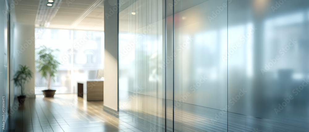 Blick durch Glastür auf eine Bürofläche mit sanftem Licht – moderne Architektur und Design #1708606475