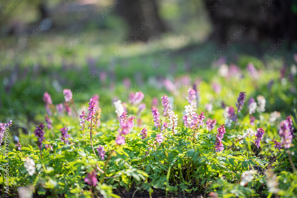 Blooming spring wildflowers in a sunlit meadow with soft focus and natural bokeh. Fresh green foliage and delicate pink and white blossoms create a calm, peaceful atmosphere. Minimal processing. #1973776675