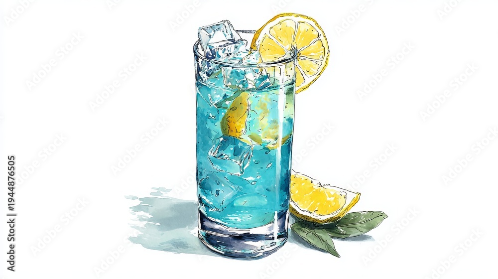Blue lagoon cocktail, served in a tall glass with ice and lemon slices, shown in a simple drawing. #1944876505