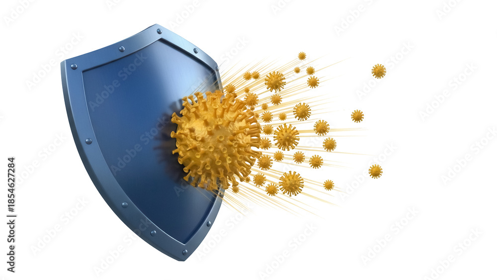 Blue shield protecting against yellow virus PNG isolated on transparent background, concept for health care and protection from disease #1854627284