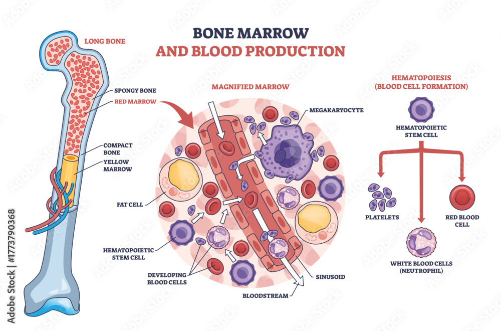 Bone marrow hematopoiesis shown with long bone cross-section, stem cells forming red and white blood cells and platelets, key objects, stem cell, megakaryocyte, sinusoid. Outline diagram #1773790368
