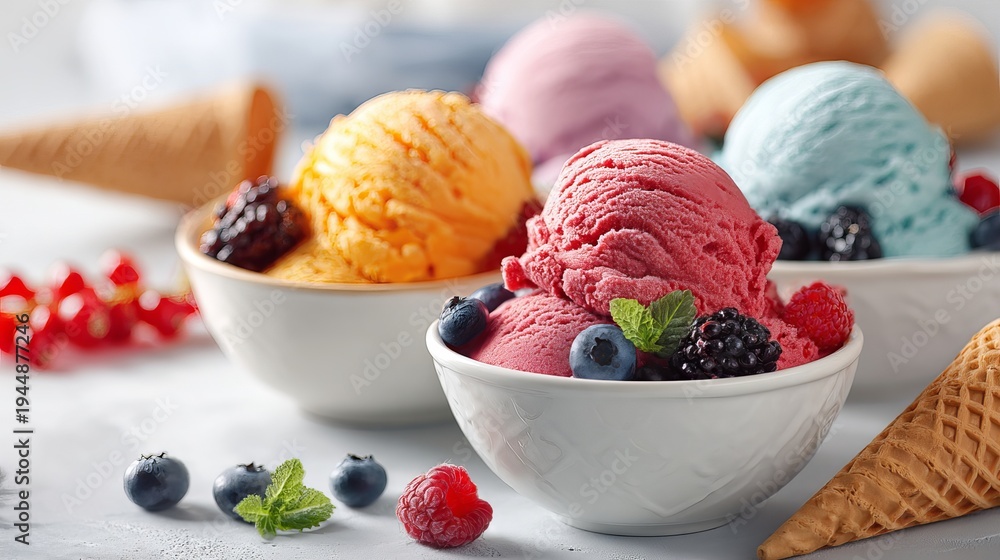 Bright, colorful ice cream scoops in bowls, topped with berries and waffle cones, sit on a white surface. #1944877246