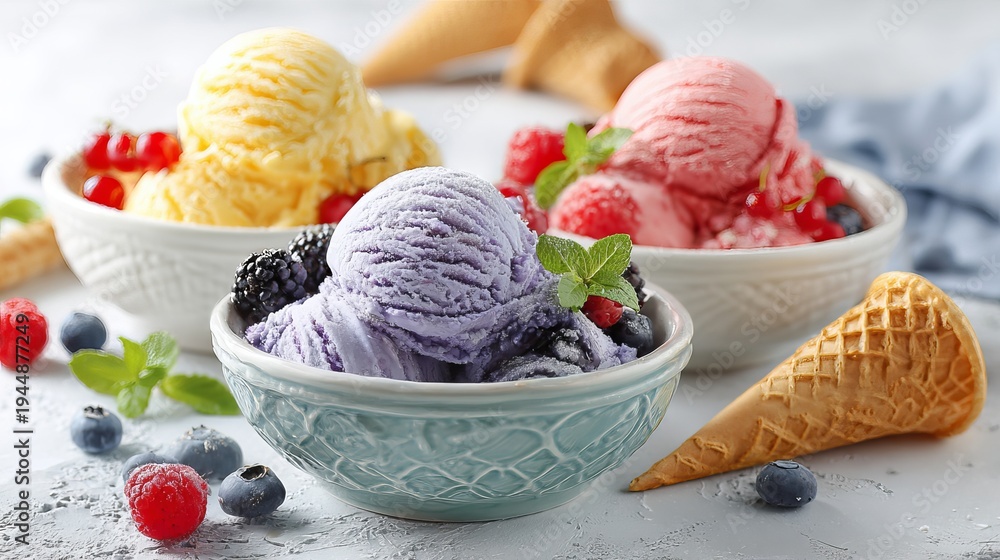 Bright, colorful ice cream scoops in bowls, topped with berries and waffle cones, sit on a white surface. #1944877249