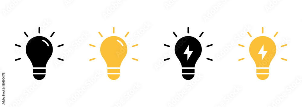 Bright idea lightbulb icons showing creativity, innovation, solutions, inspiration, electricity, and energy concepts in clean bold shapes for UI and modern designs. #1805904173
