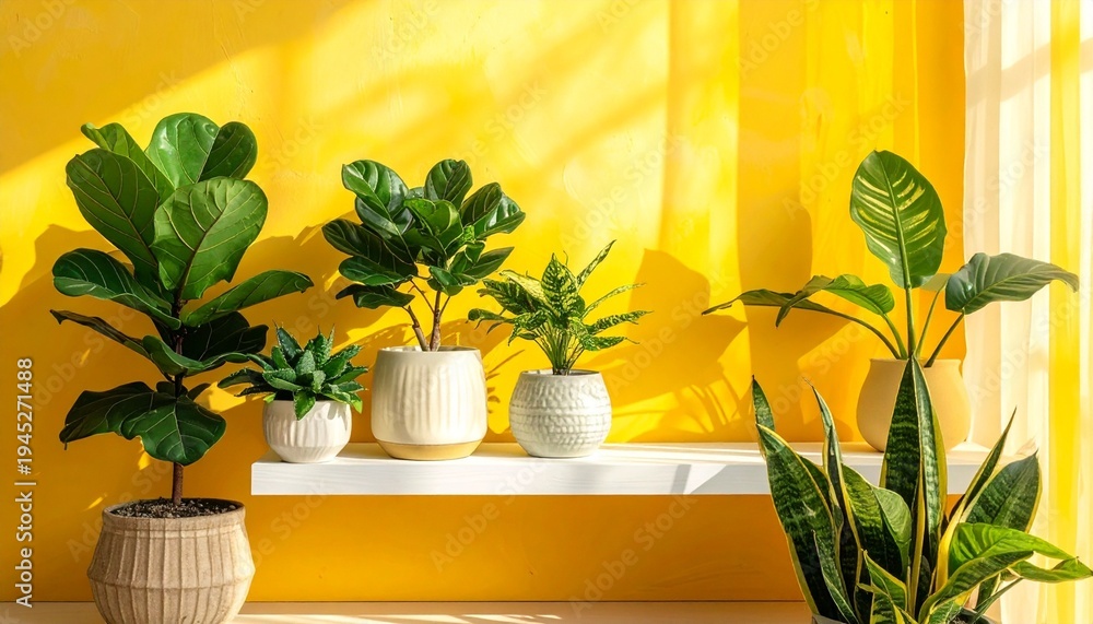 Bright indoor living space with potted houseplants against yellow wall symbolizing natural decor wellness and serene atmosphere #1945271488
