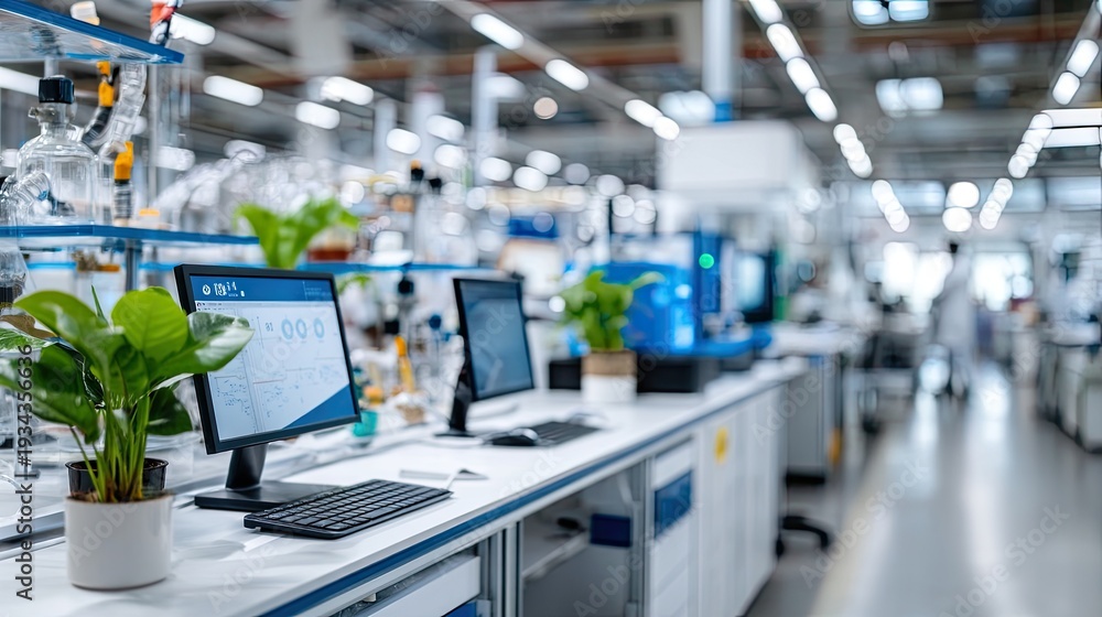 • #1971066102 Laboratory features glass containers and scientific tools on a clean surface. The setting is designed for research and experiments
