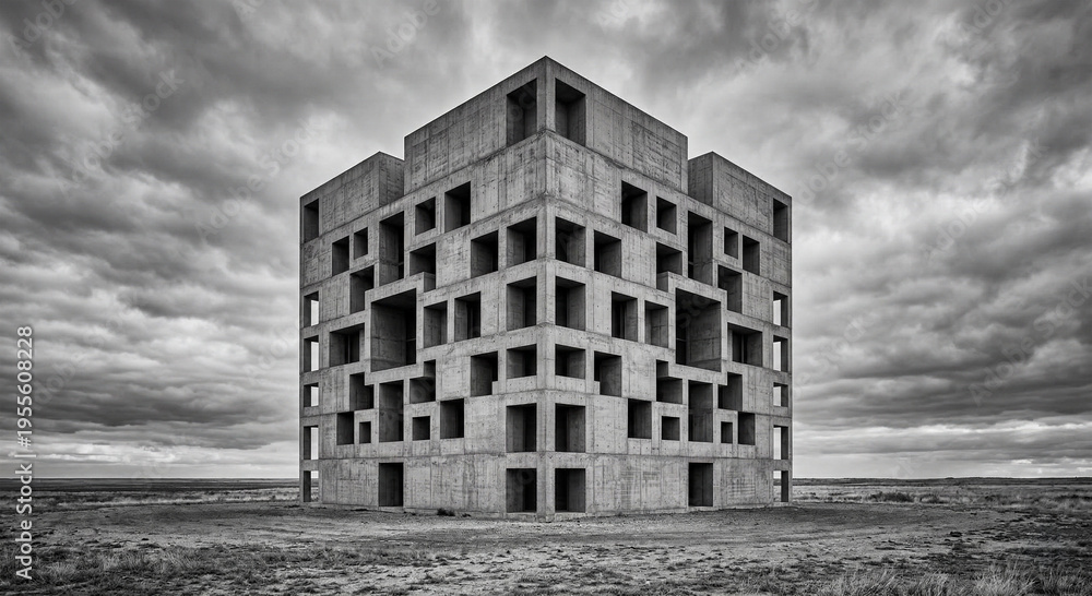 Brutalist Concrete Cube Building with Geometric Openings Under Dramatic Cloudy Sky, Modern Architecture Concept #1955608228