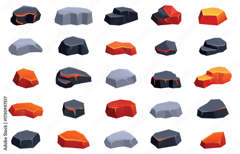 Burning coal stones. Charcoal smoldering, burnt hot and warm stone or briquette. Cartoon barbecue, campfire, grill burn elements, sapid vector clipart #1730997517
