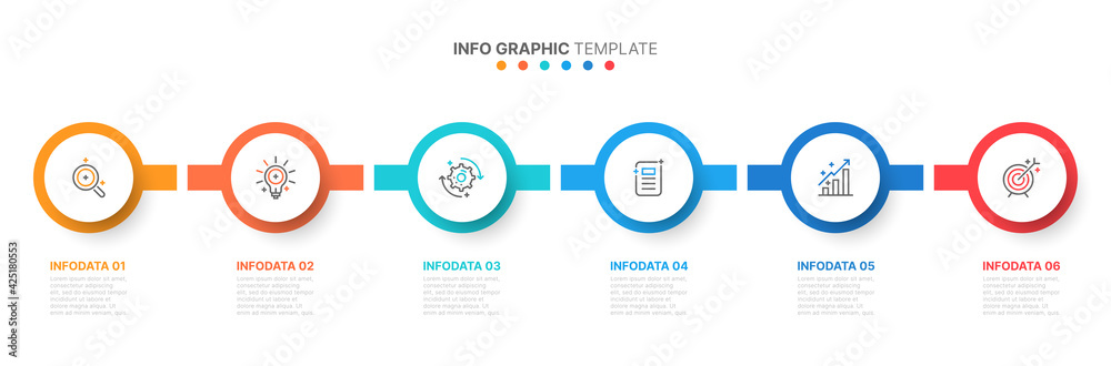 Business infographic template with circles design and marketing icons. Timeline with 6 number options. Vector illustration. #425180553
