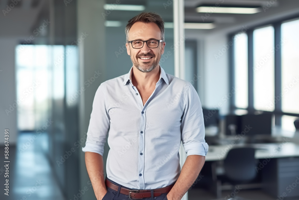 • #588716222 business man with shirt stands casually in modern glass office and smiles at camera - theme success, ERP, business or boss - Generative AI