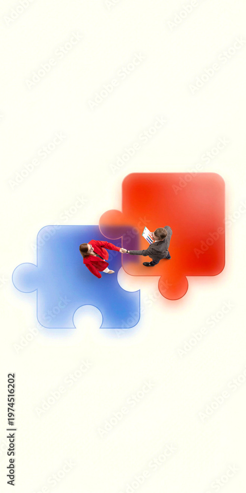 Business people shaking hands across puzzle pieces from top view. Concept of business partnership agreement, cross team collaboration, deal closing moment, trust building interaction. #1974516202