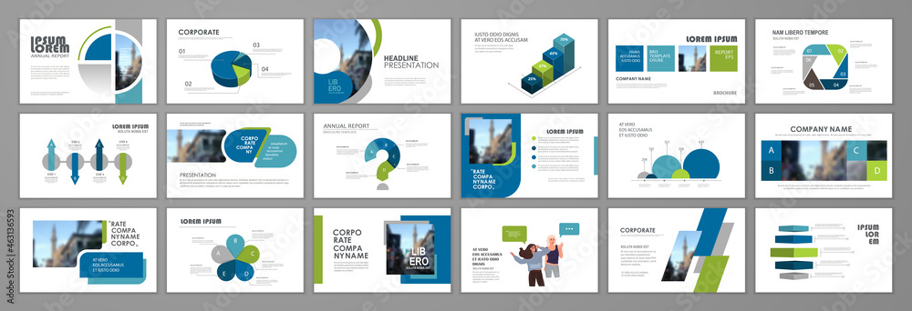 Business presentation infographic template set. Keynote presentation background, slide templates, website ideas, brochure cover design, landing page, annual report brochure. Vector Illustration #463136593