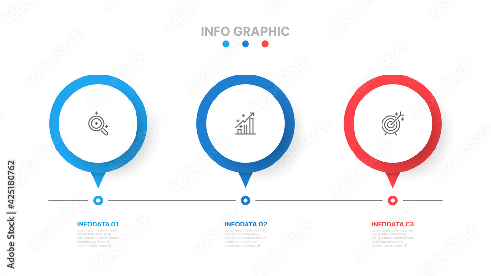 Business process with location and icons. Timeline with 3 steps, options. Vector illustration. Can be used for workflow layout, diagram, annual report, presentation, web design. #425180762
